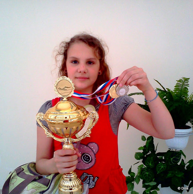 Осенью был кроль, где Ольгуня заняла 1е место в своей группе - девочки 2001-2002 года рождения, а группа это где-то девочек 30. Потом была спина, где Ольгуня так же заняла 1е место, ближе к весне был брасс - где Олькин заняла 3е место (болела пропускала и не очень была поставлена техника - вышла на одной физухе).