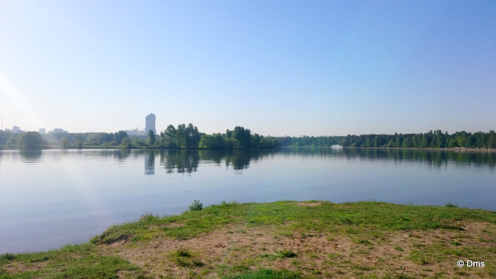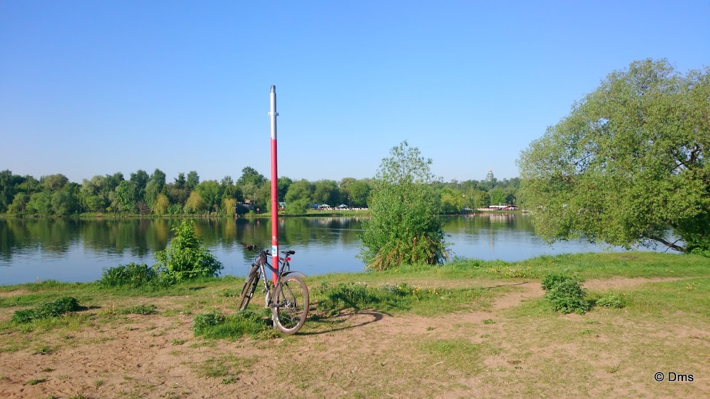 Красиво, птички поют, пахнет цветением. Но бежать, жуть, как тяжело. Я весь мокрым стал в один момент. Бегу на пульсе 135 и пыхчу, как паровоз. Переходил пару раз на ходьбу, зачем себя насиловать. Пробежал три километра, смотрю - по времени уже пора ехать искупаться и домой, завтракать и на работу. Вел охранял пес - никого не подпускал и отчаянно тявкал. Сел на вел и поехал на пляж напротив Серебряного бора.