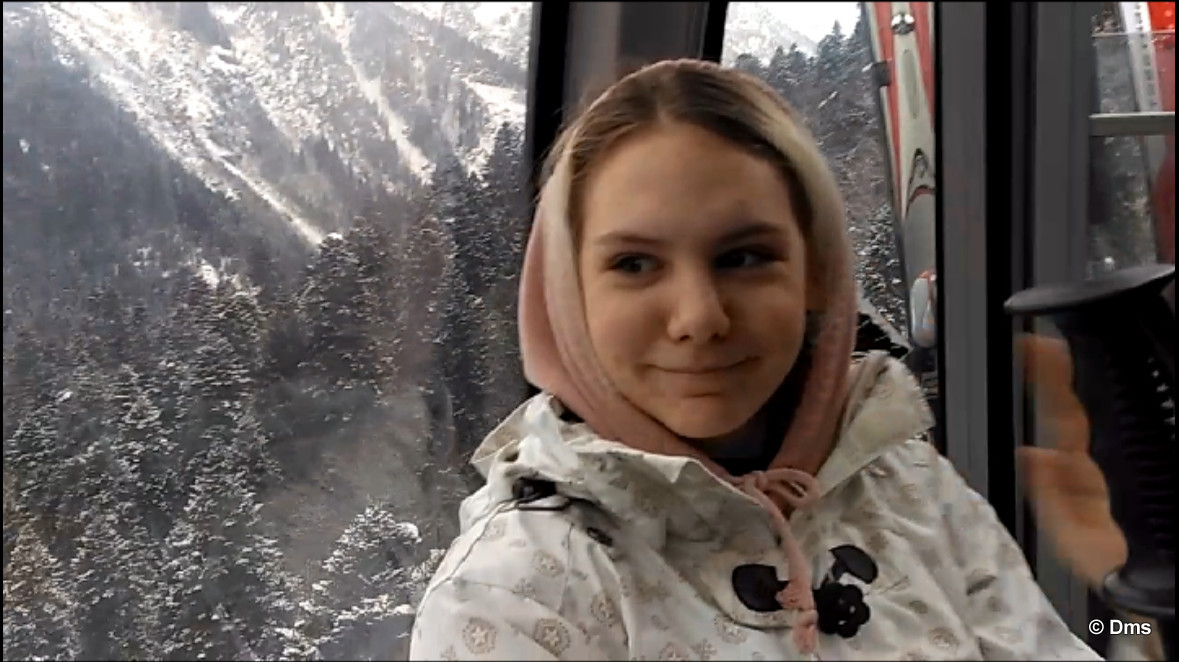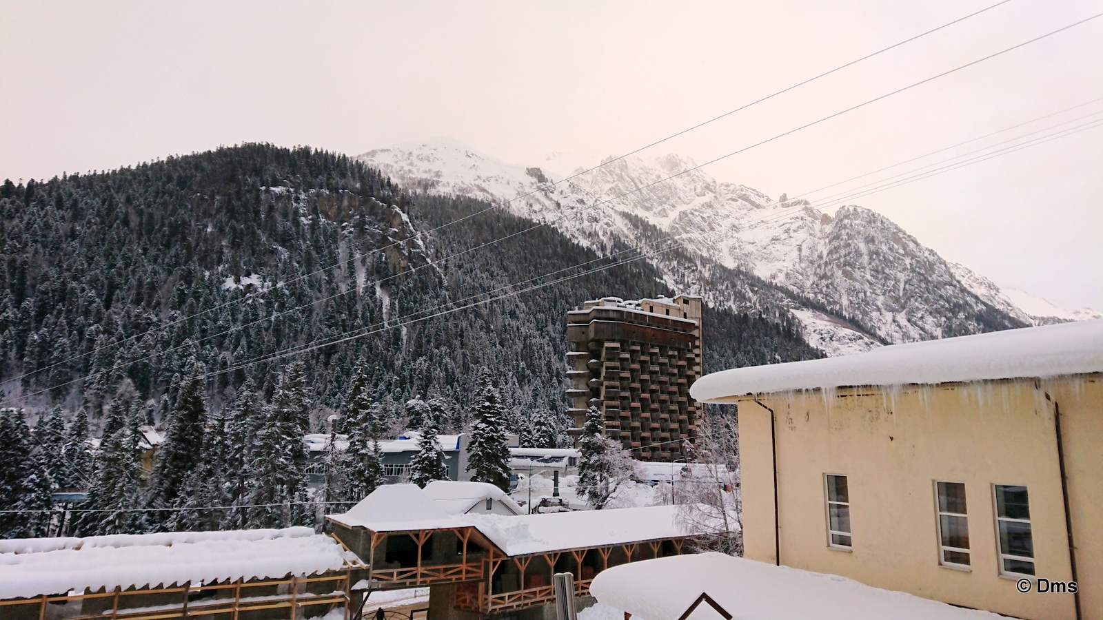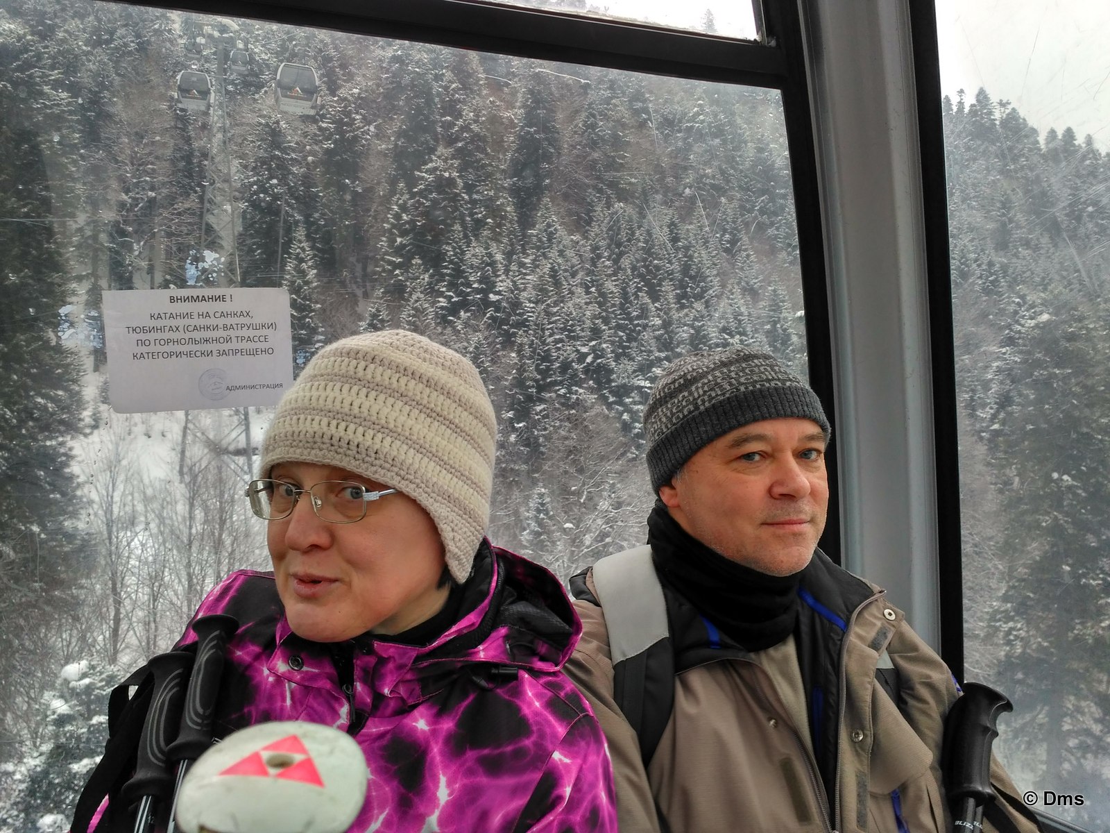 Вершины еле видно. Позавтракали в столовой 250р завтрак, оделись и пошли на подъемник. Подъемники работают, сказала нам продавец скипасов, но ветер сильный, в любой момент могут отключить шестикреселку. Купили однодневные билеты все, кроме Стаса. Стас взял сразу скипас на шесть дней.