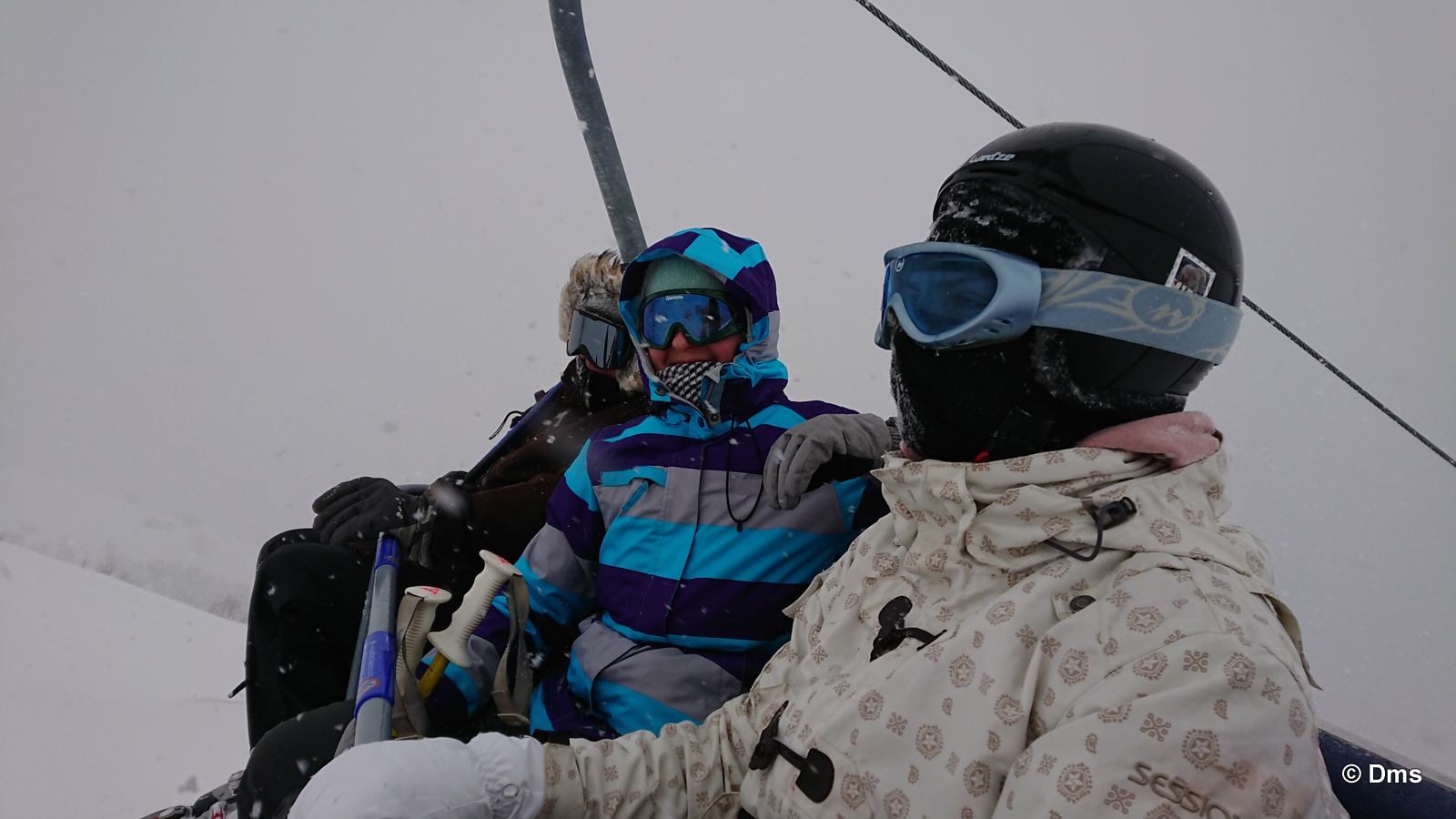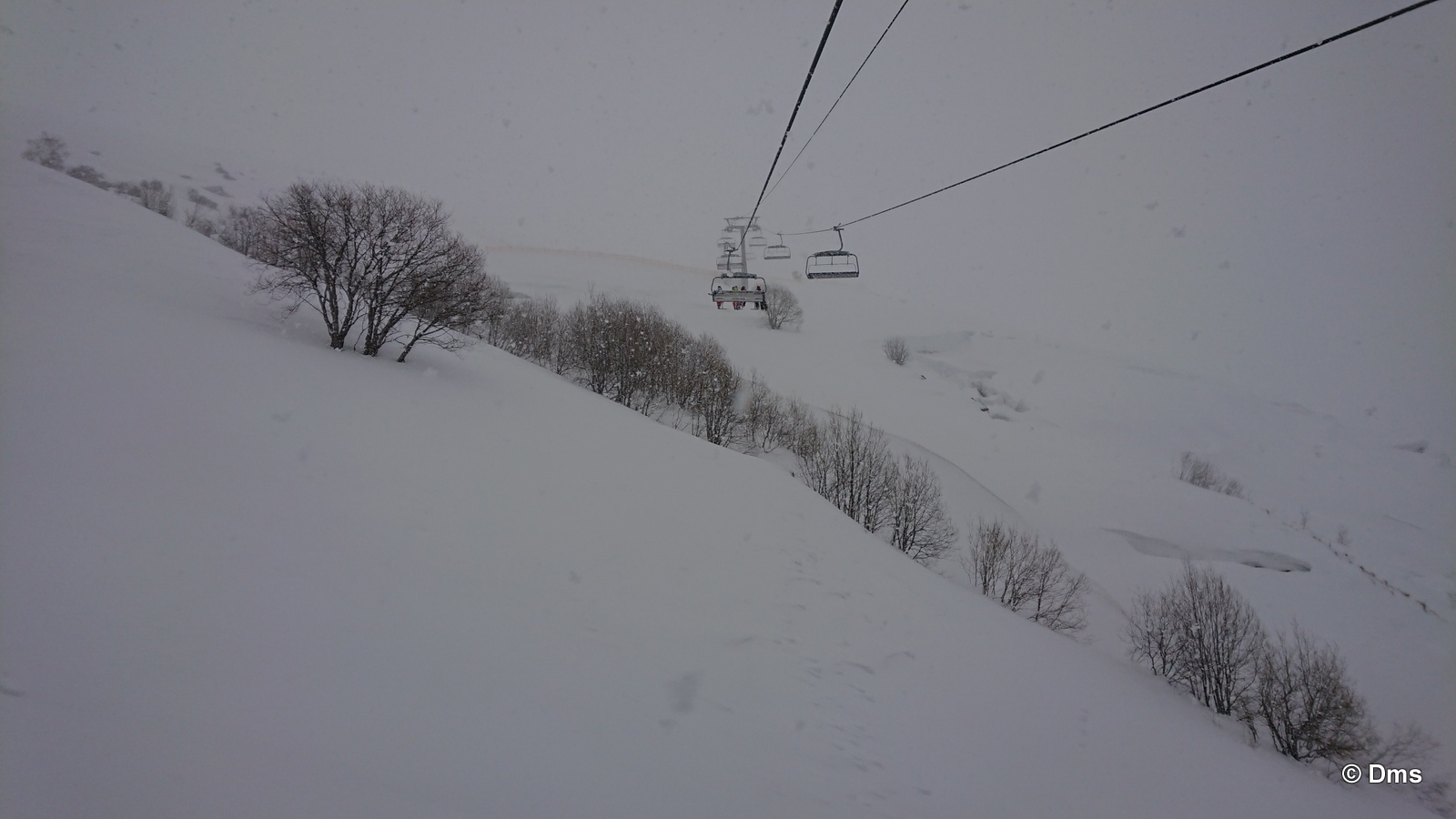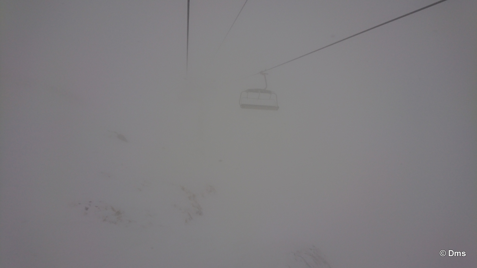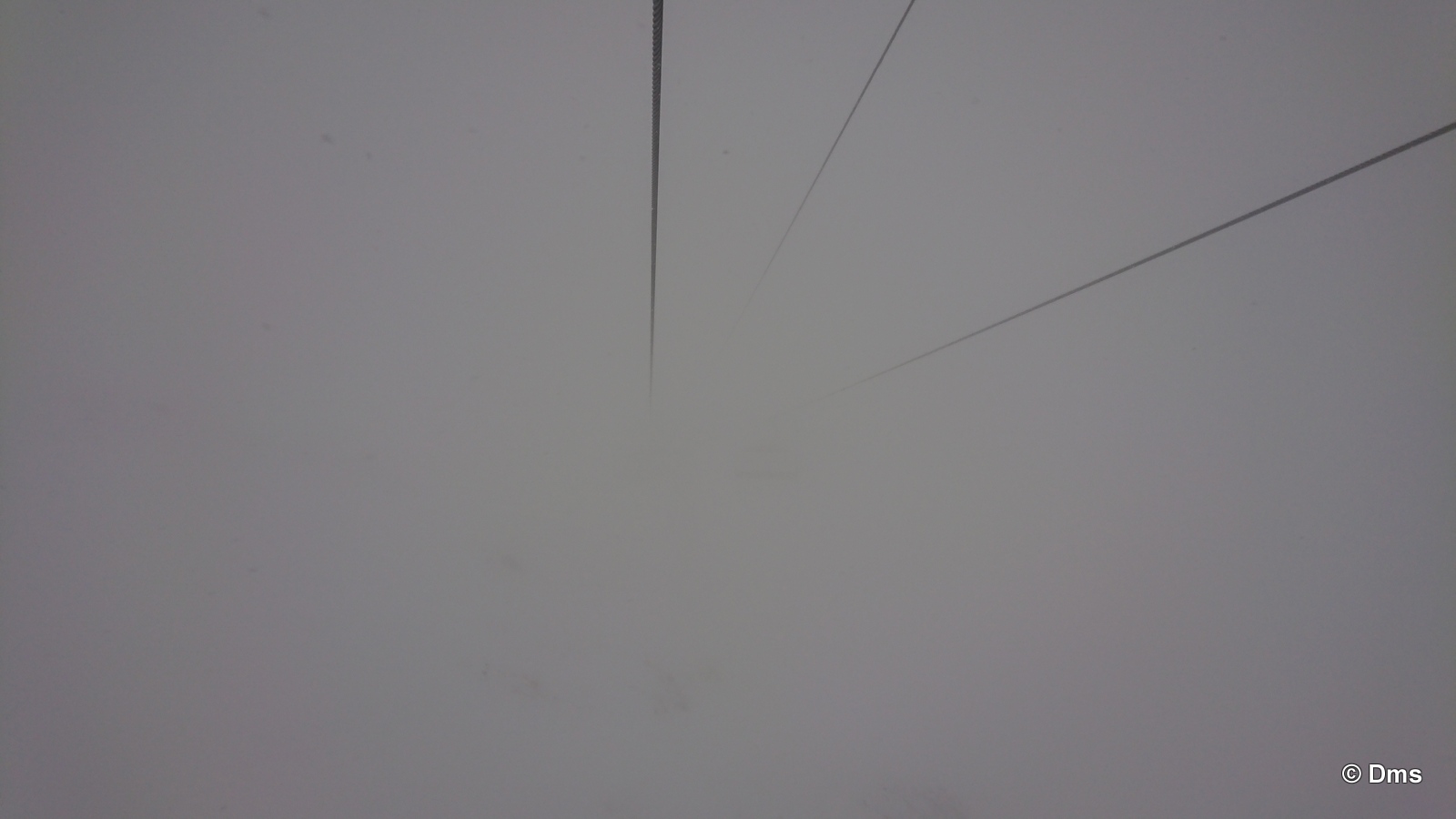 Снег метёт бешенно. А дальше самое интересное - каталка. Видимость наверху, в зависимости от порывов ветра и снеговых зарядов, метров 20-100, в среднем метров 30-50. Едешь в серой, снежной сфере, появляется бордер или лыжник, пропадает. Рельефа не видно вообще, не чувствуется круто или совсем плоско, есть кочки под ногами или нет. Хорошо, что чем ниже, тем виднее. Плюхнулся на какой-то кочке - сезон открыт. Трассы вообще незнакомые, поэтому едем по вешкам. Вешки ограничивают зону катания, идешь вдоль них, вроде как никуда вниз не сверзишься.