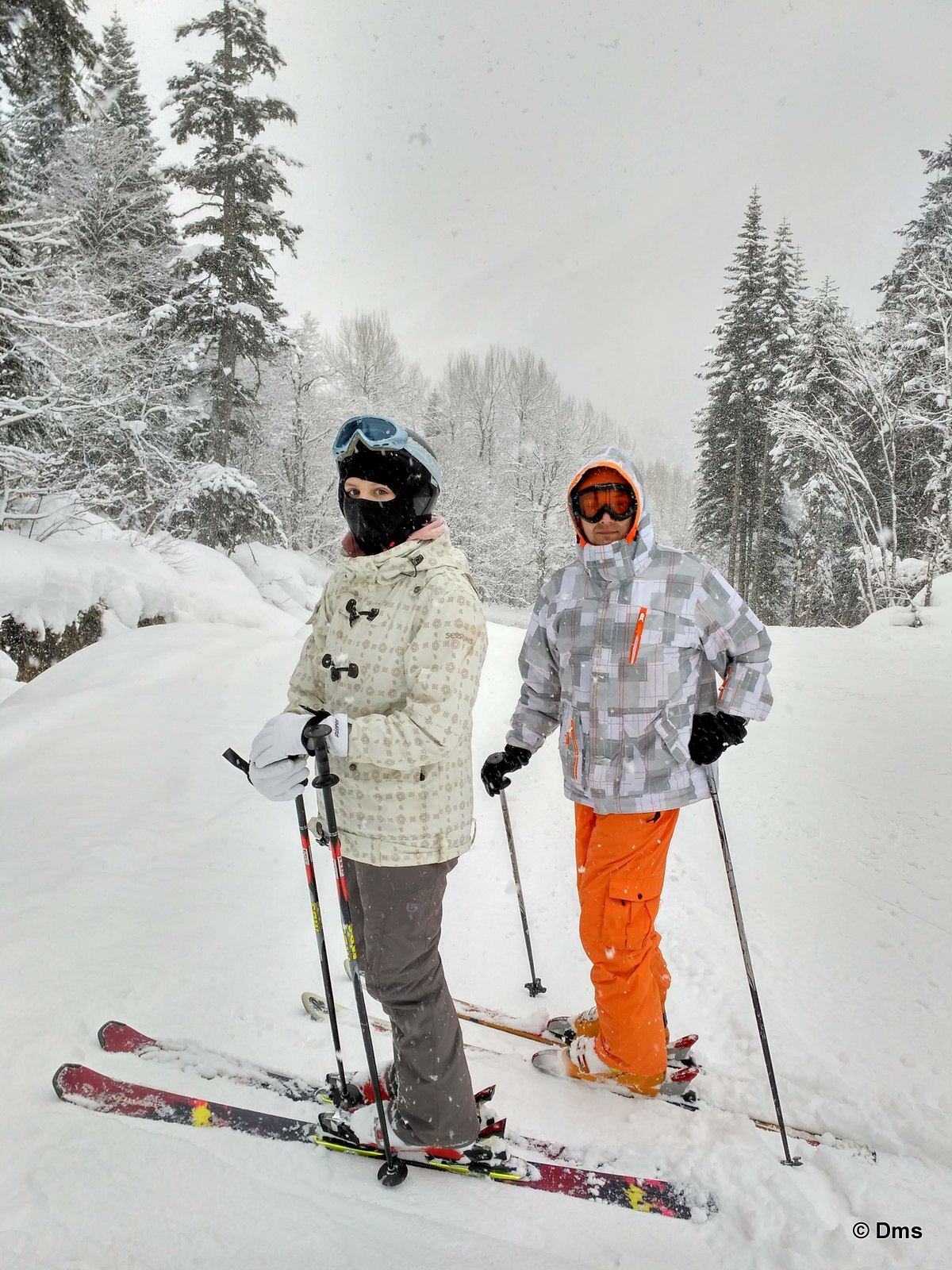 После знакомства с трассой, стало полегче, но все равно боязнь заехать не туда осталась. Покатались, пора на обед. Спустились ниже, там уже не так сурово. Спуск по лесной.