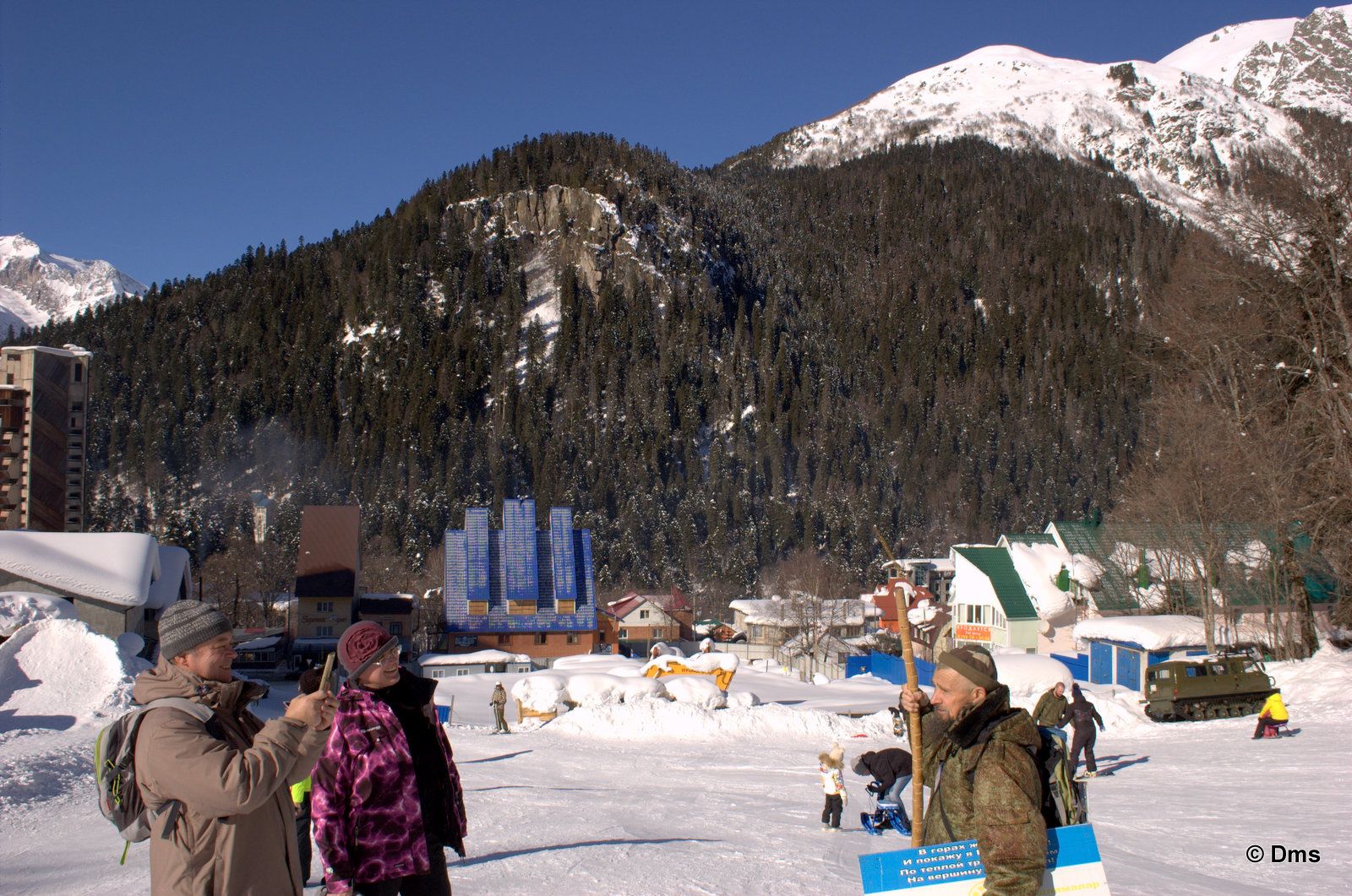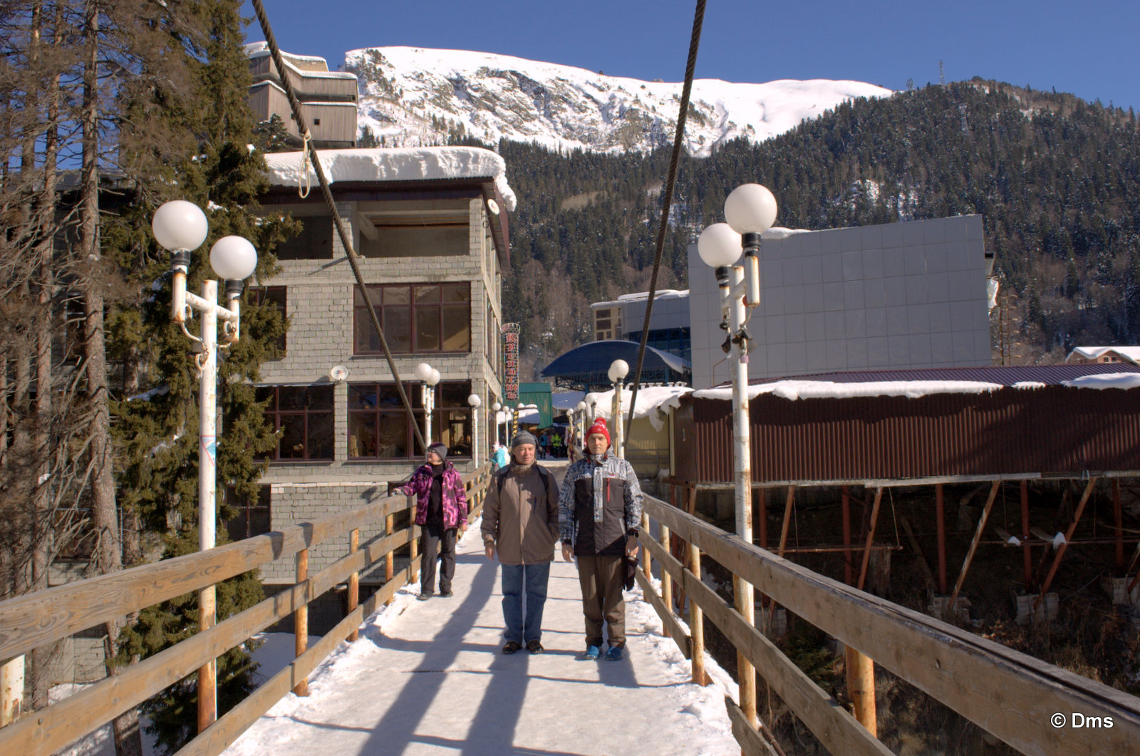 Сережка с Дианой уже купили скипассы на старый на этот день, а мы с мамАанькой пошли покупать билеты на новый подъемник. Сережка с Дианой составили нам компанию. За нами гора Мусса-Ачитара, с которой мы катаемся. Мы на вантовом мосту через