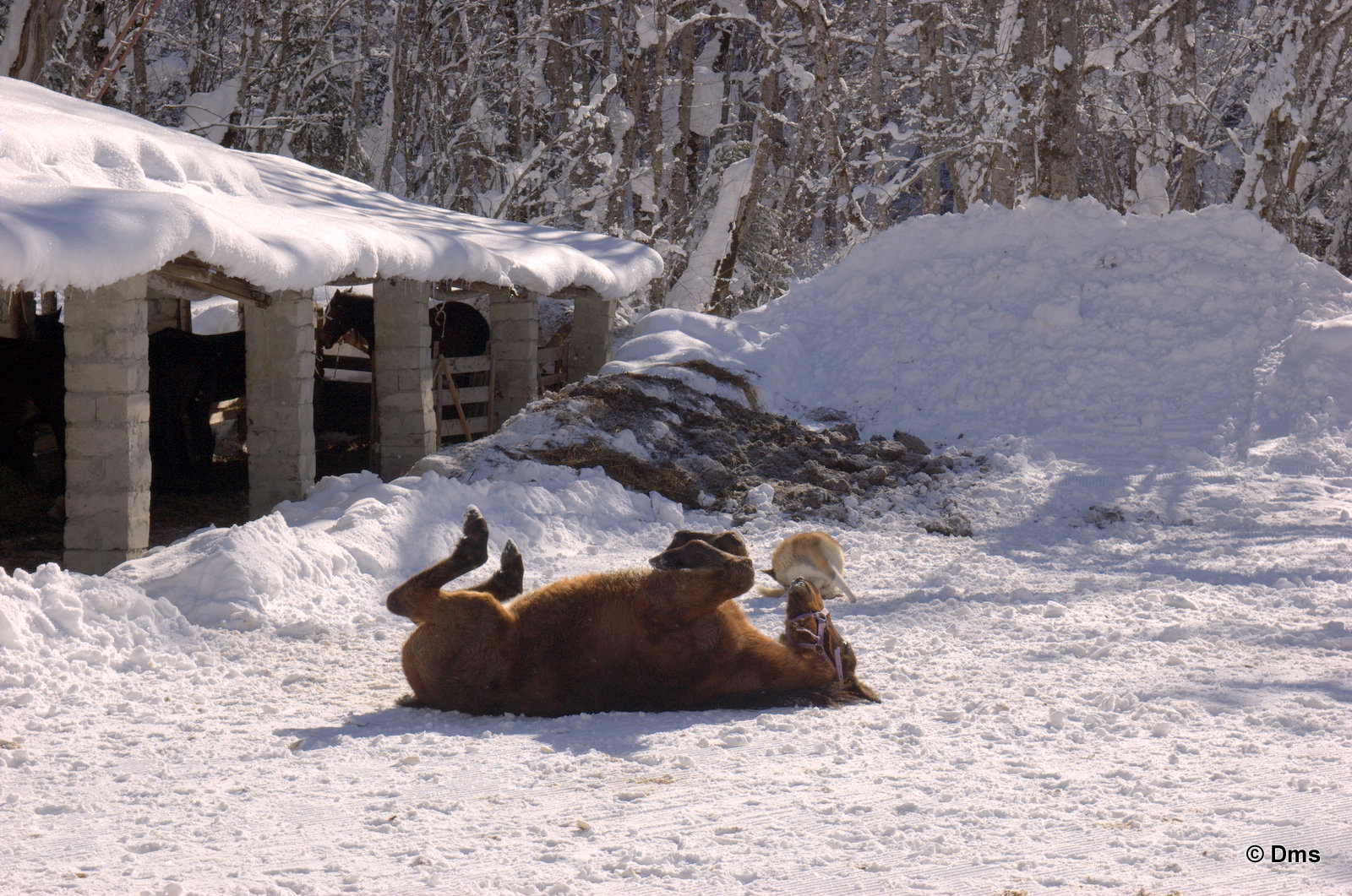 Вышли к лошадкам. Одна лошадка вышла из стойла, легла на спину и давай себя чесать о свежий снег.