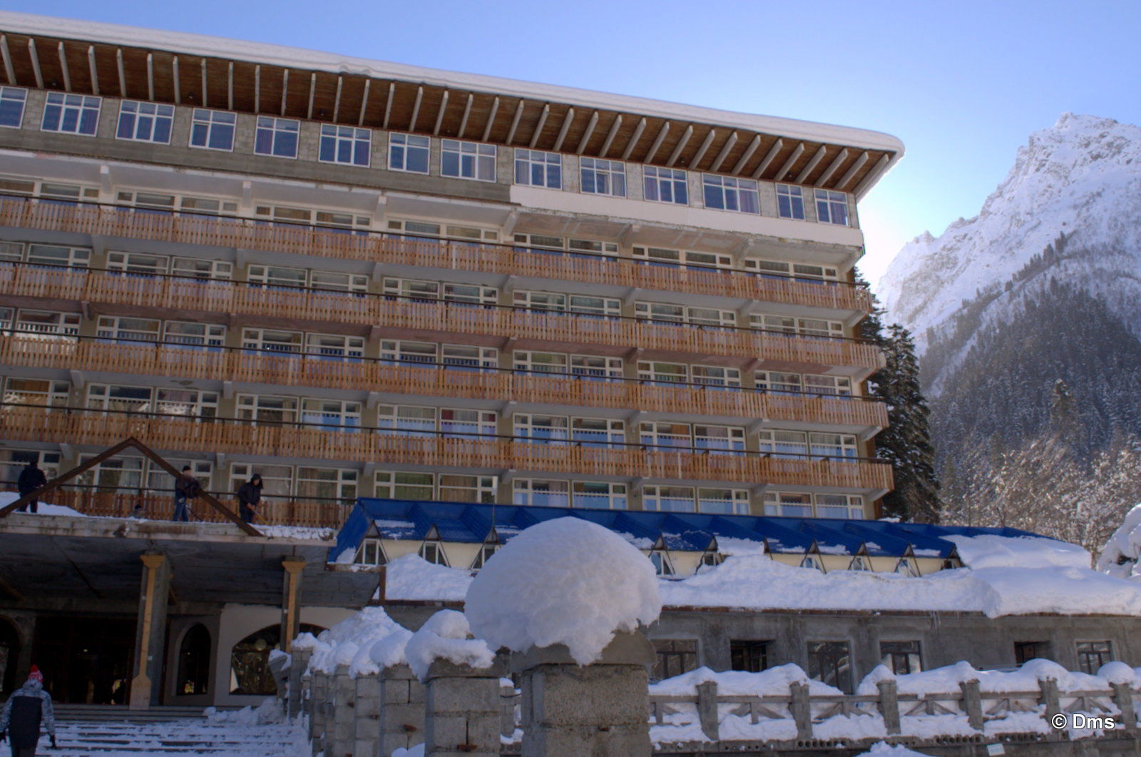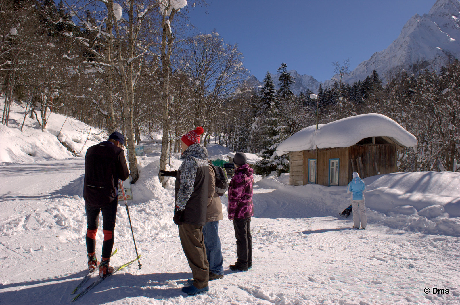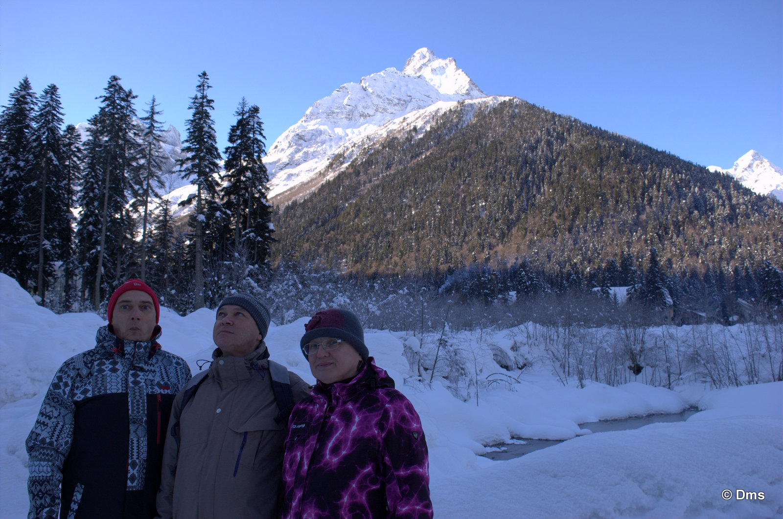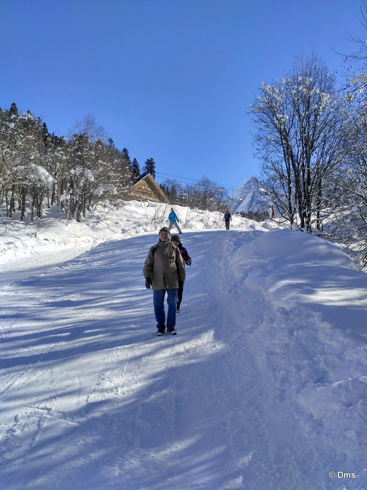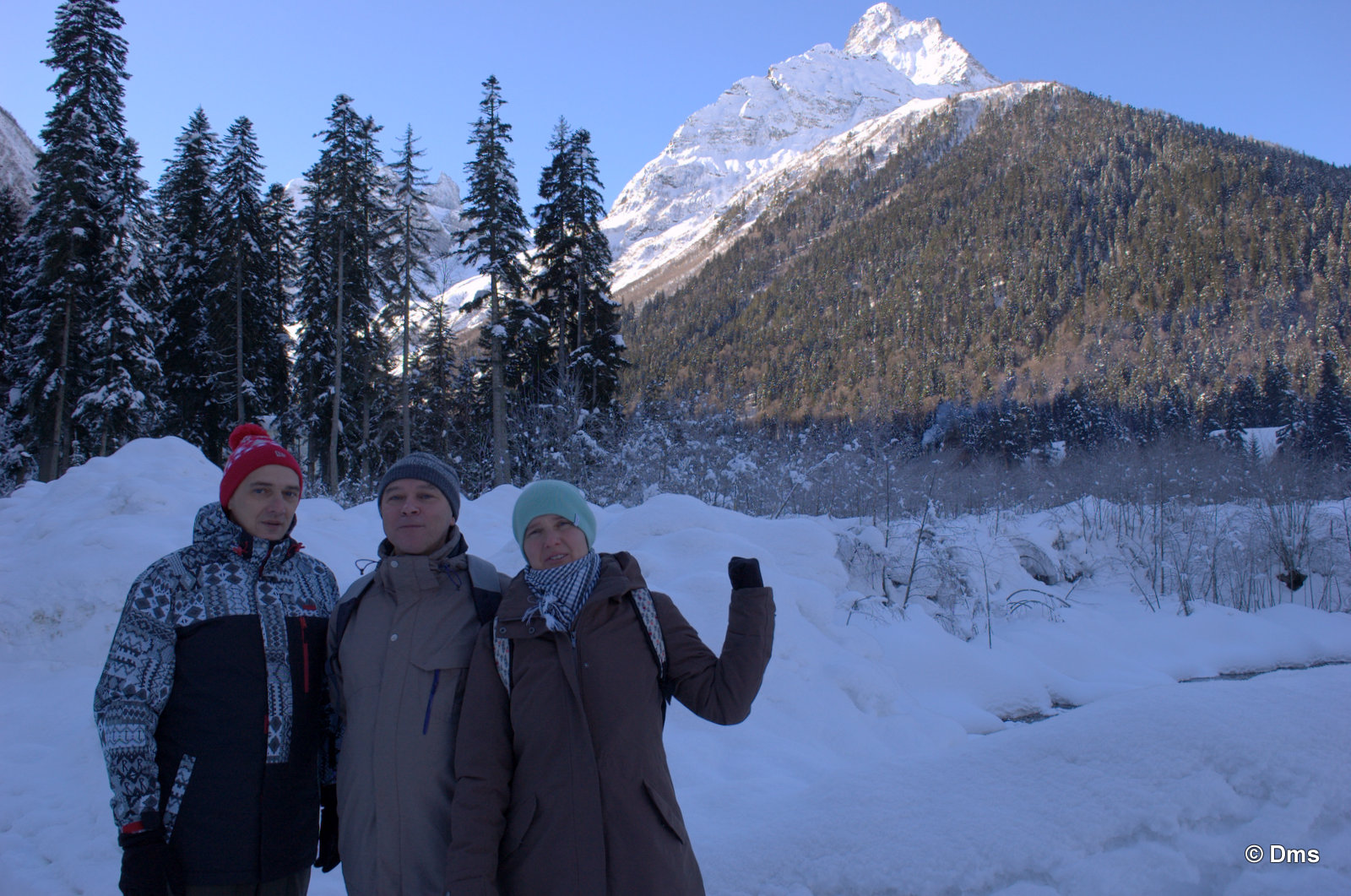 Встали утром, небо синее, солнце сияет. Сходили позавтракали, принесли Ольке завтрак в номер. Олька лежала в кроватке и нежилась. Стас, купивший скипасс на неделю, естественно уехал кататься. Олька сказала, что она не хочет никуда идти, а останется до обеда дома. Еще вчера нас предупредили, что сегодня в одиннадцать будут стрелять из пушек - спускать лавины. Ясно, что высоко поднимать не будут, на горе особо делать нечего. Я и предложил: "А давай пойдем погуляем, здесь вроде есть водопады замерзшие, нарзанные источники..." Звякнули Сережке и нашли поддержку предложения. Решено. Идем гулять до обеда, а с часа возьмем полдневные скипассы и пойдем кататься. Пока собирались началась стрельба, стрельнули раз пятнадцать, мы потом поднимались на Домбай2, видели на склоне шесть рытвин от снарядов, но лавина сошла не там. А где-то дальше по Аманаузскому ущелью. Сначала хлопок, а потом эдакий гром раскатистый.