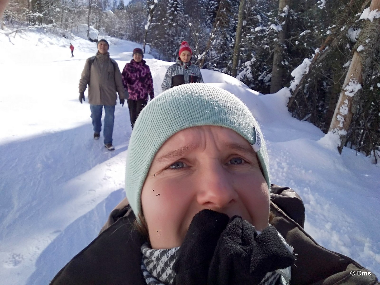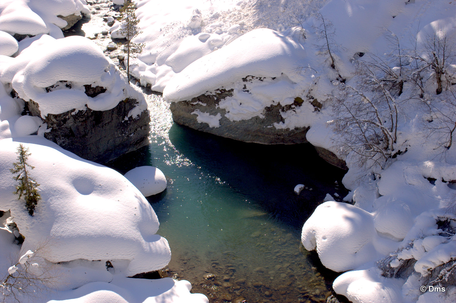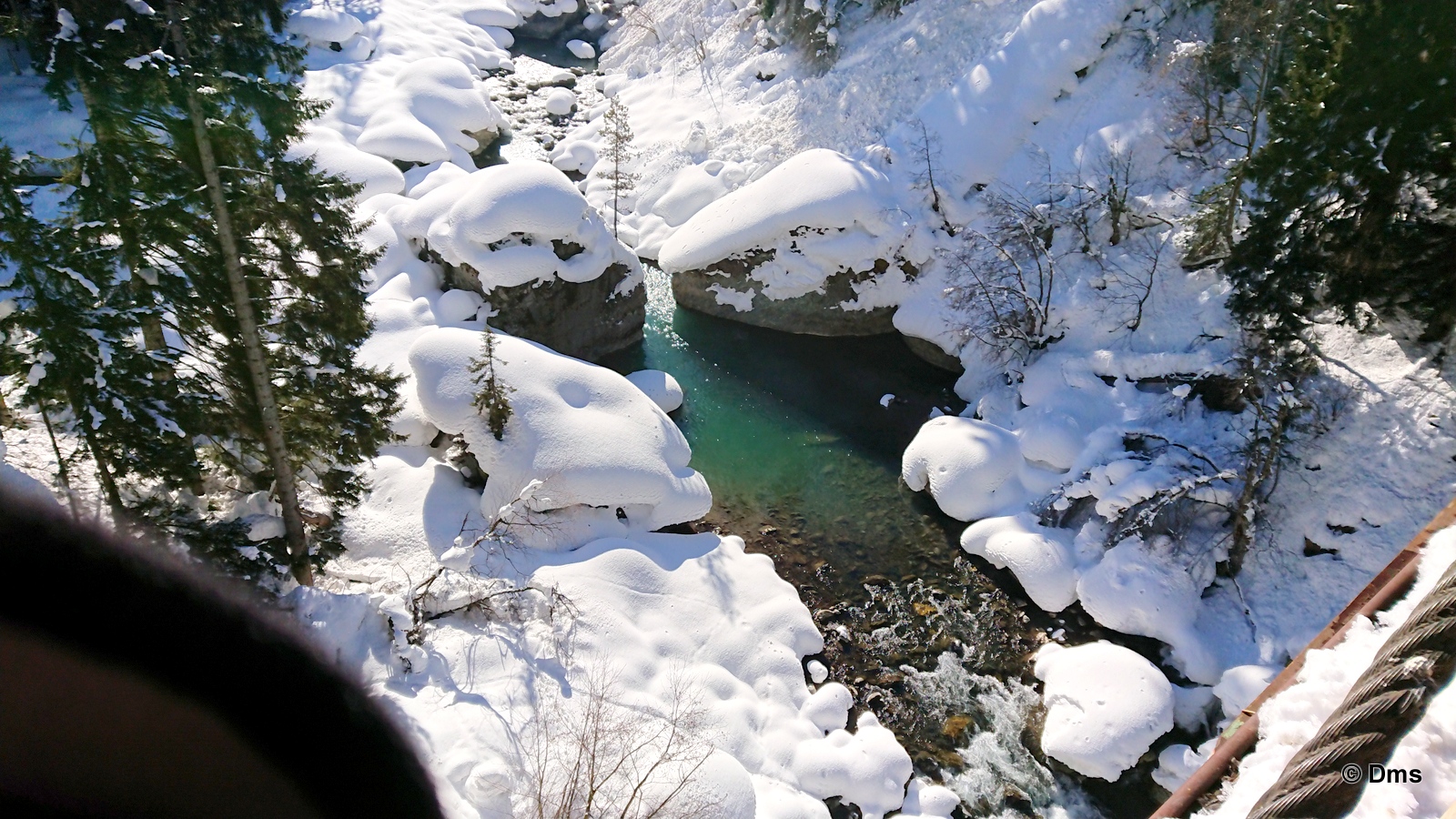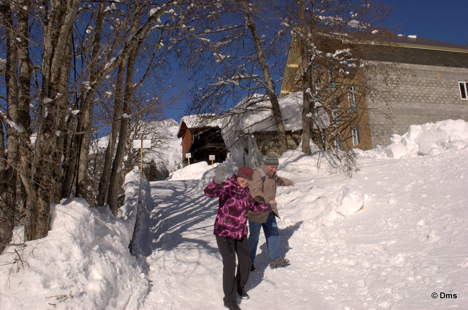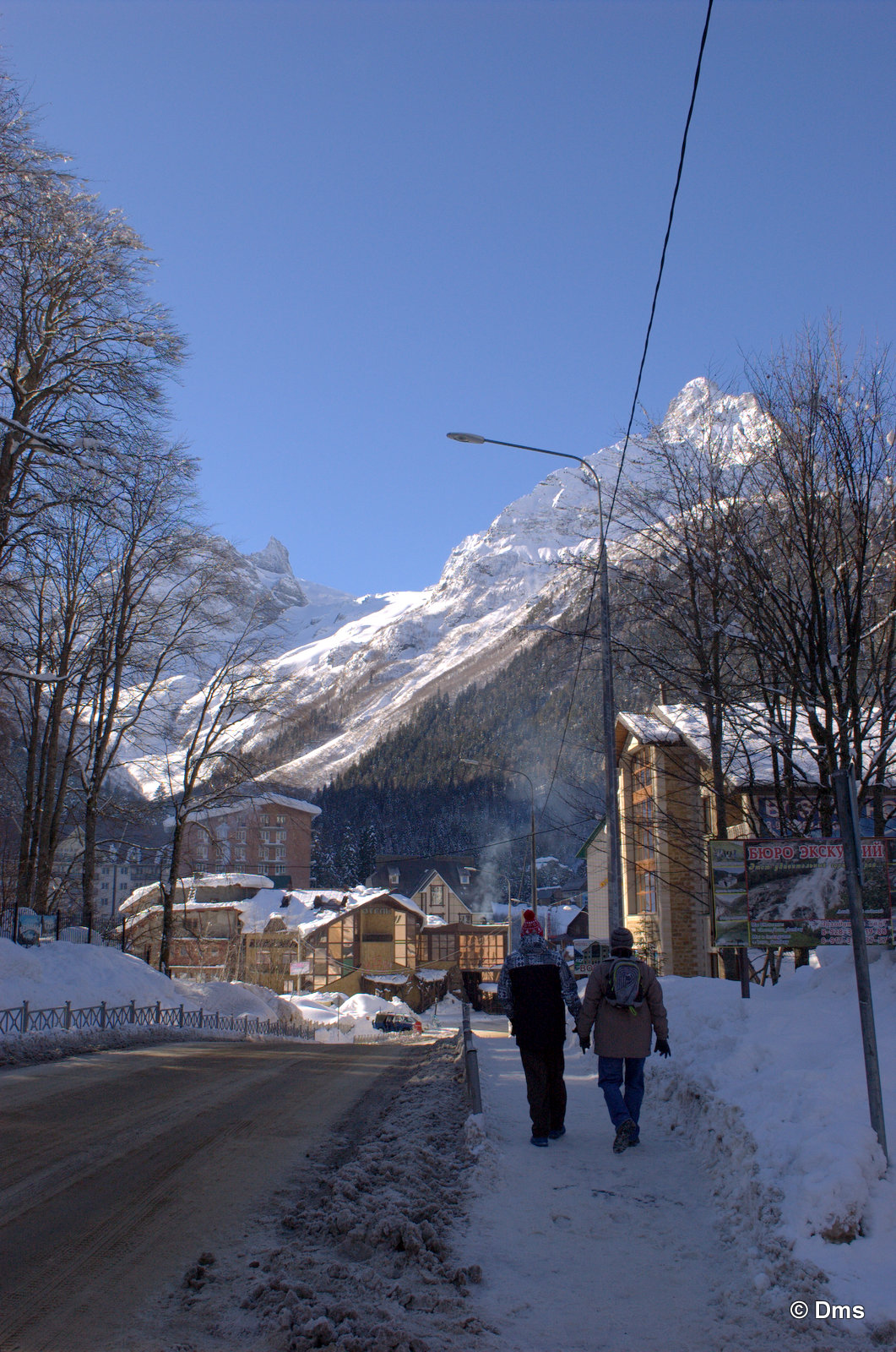 Встали утром, небо синее, солнце сияет. Сходили позавтракали, принесли Ольке завтрак в номер. Олька лежала в кроватке и нежилась. Стас, купивший скипасс на неделю, естественно уехал кататься. Олька сказала, что она не хочет никуда идти, а останется до обеда дома. Еще вчера нас предупредили, что сегодня в одиннадцать будут стрелять из пушек - спускать лавины. Ясно, что высоко поднимать не будут, на горе особо делать нечего. Я и предложил: "А давай пойдем погуляем, здесь вроде есть водопады замерзшие, нарзанные источники..." Звякнули Сережке и нашли поддержку предложения. Решено. Идем гулять до обеда, а с часа возьмем полдневные скипассы и пойдем кататься. Пока собирались началась стрельба, стрельнули раз пятнадцать, мы потом поднимались на Домбай2, видели на склоне шесть рытвин от снарядов, но лавина сошла не там. А где-то дальше по Аманаузскому ущелью. Сначала хлопок, а потом эдакий гром раскатистый.